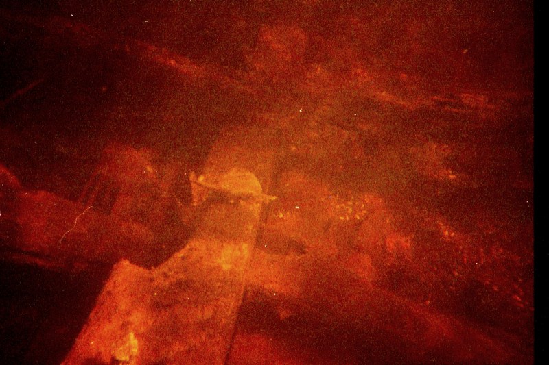 Another view along the keelson showing some of the ribs. The red colour cast is caused by the peaty water