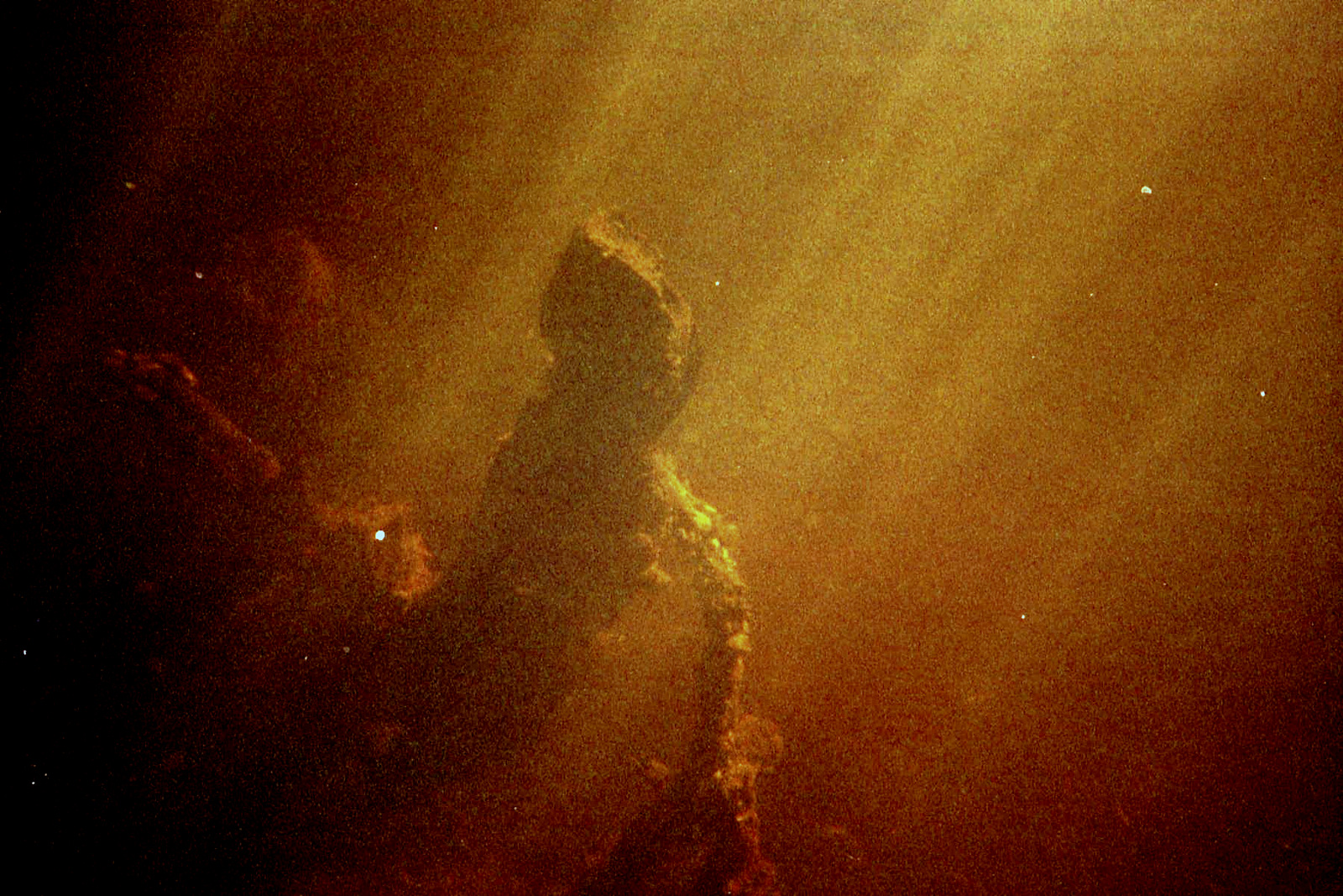 The remains of the prow. The narrower part, forward of the main prow, is metal and may have continued upward; it may have been bent over during the firewood salvage of 1959