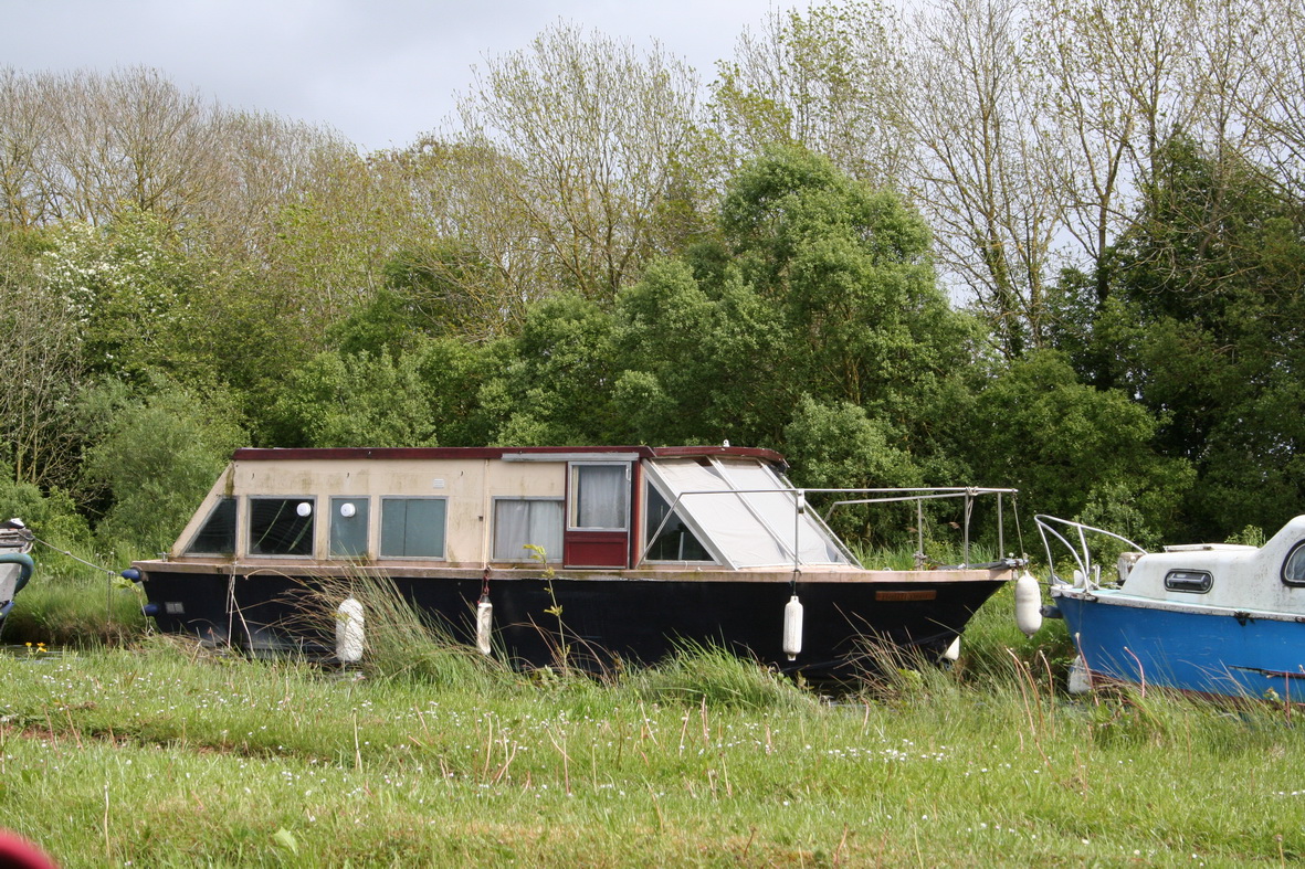 Here’s another vessel from the Barrow. Dawn Star was designed by a New Zealand naval architect living at Slyguff. You may just be able to see the small white nylon roller on the starboard quarter: there were rollers at all four corners, so that the boat would not need fenders when rising or falling in locks. The boat also had a large mesh platform at the stern to provide easy access for clearing the outdrive(s) of weed.