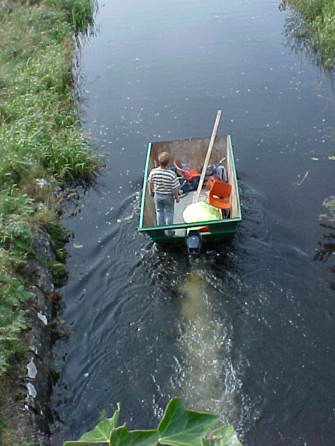 That reminds me of the multi-function workboat … er, perhaps I should rephrase that: “workcraft” might be more accurate … from the River Boyne, used by An Taisce and the IWAI Boyne Navigation Branch. Thanks to Seamus Costello for this photo of the craft on its regular recyclables-collection service: