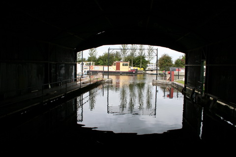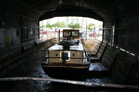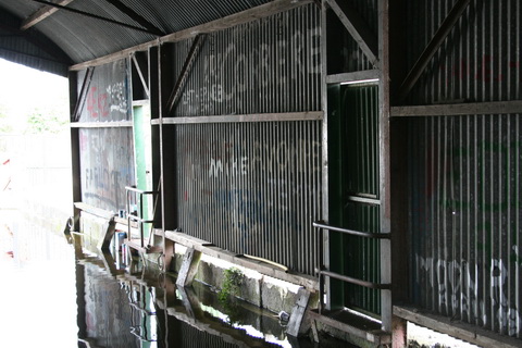 The entrance to the covered dry dock. The black grille can be lowered and raised (note the winch on the right-hand support) and is presumably intended as a barrier, but I've never seen it down and I don't really know what it's for