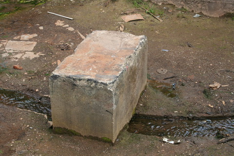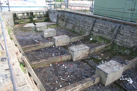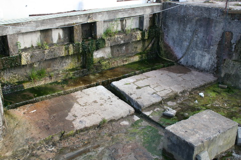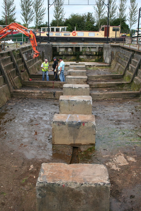 The base of the dock has large blocks spanning a drainage channel. Three blocks, in the middle, have timbers on either side, running to the dock sides, and with sloping timbers above them.