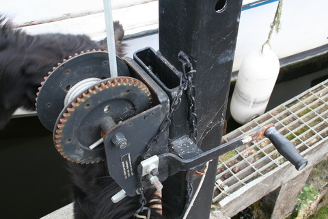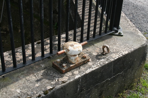 Here is a close-up showing the pillar, the winch for the grille, an old bollard and a roller to protect a taut cable from the stone edge