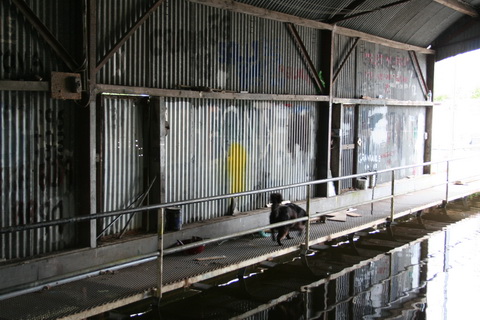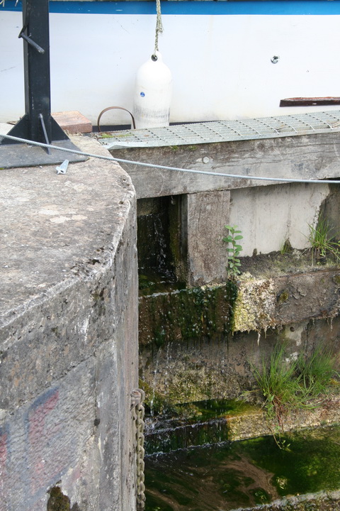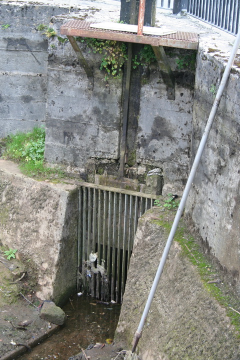 The entrance gate with three paddles in the top row. Note the drainage channel in the bed of the dock
