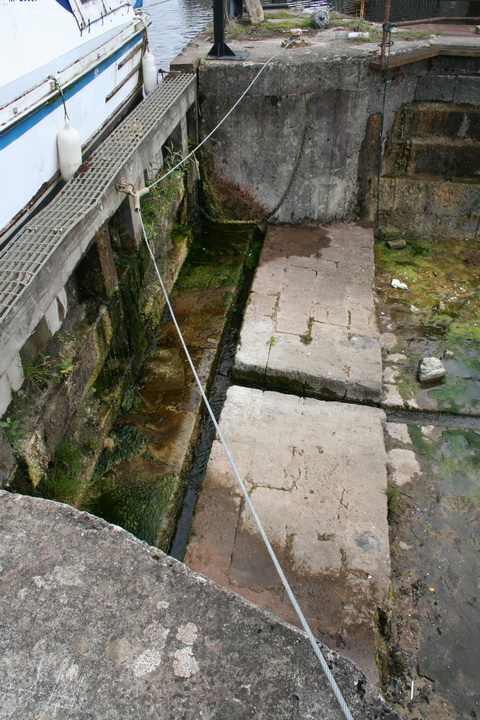 For the open as for the covered dry dock, entrance is controlled by a wooden gate, hinged at the bottom, which is dropped outwards to allow boats in.
