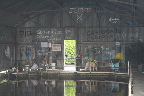 The back wall. Note the stairs on the left, the rack for emptying the dock (between the door and the dog) and the boat-names painted on the wall