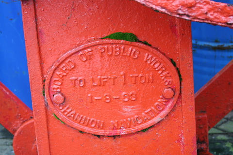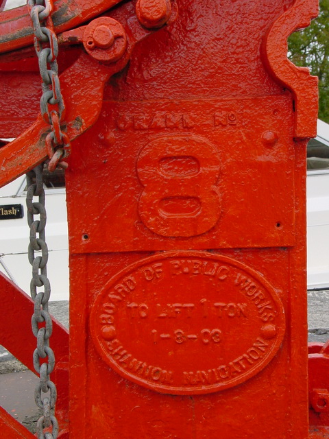 Note that the rectangular plate seems to say “Shannon Commission”. I would have expected that phrase to have fallen out of use once the Board of Works took over the Shannon, and that might suggest that this crane is older than 1900. Could the 1-8-00 be a date of inspection or refurbishment rather than a date of installation? Or might it be something other than a date?