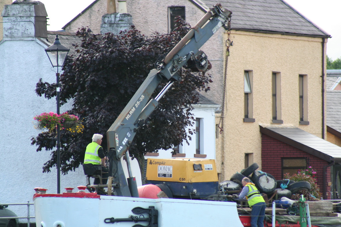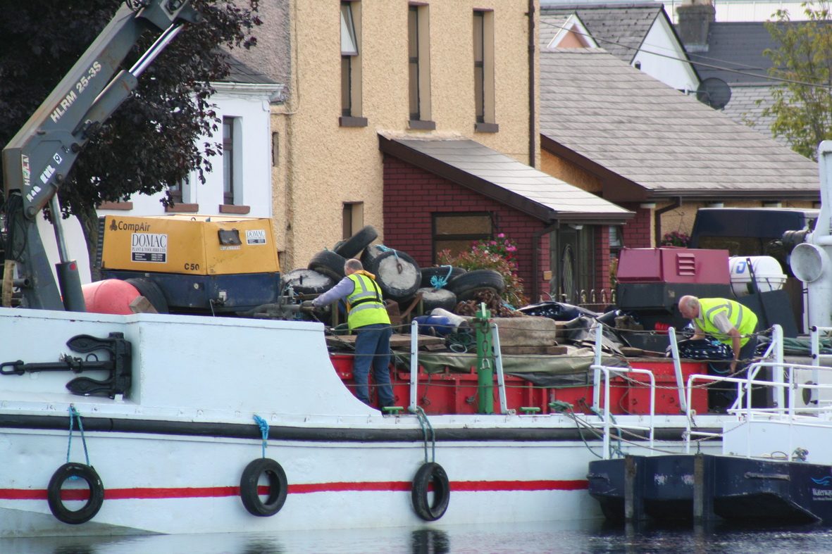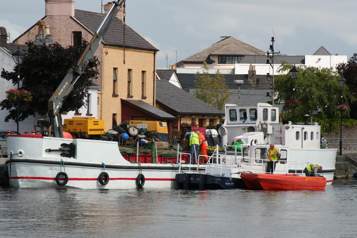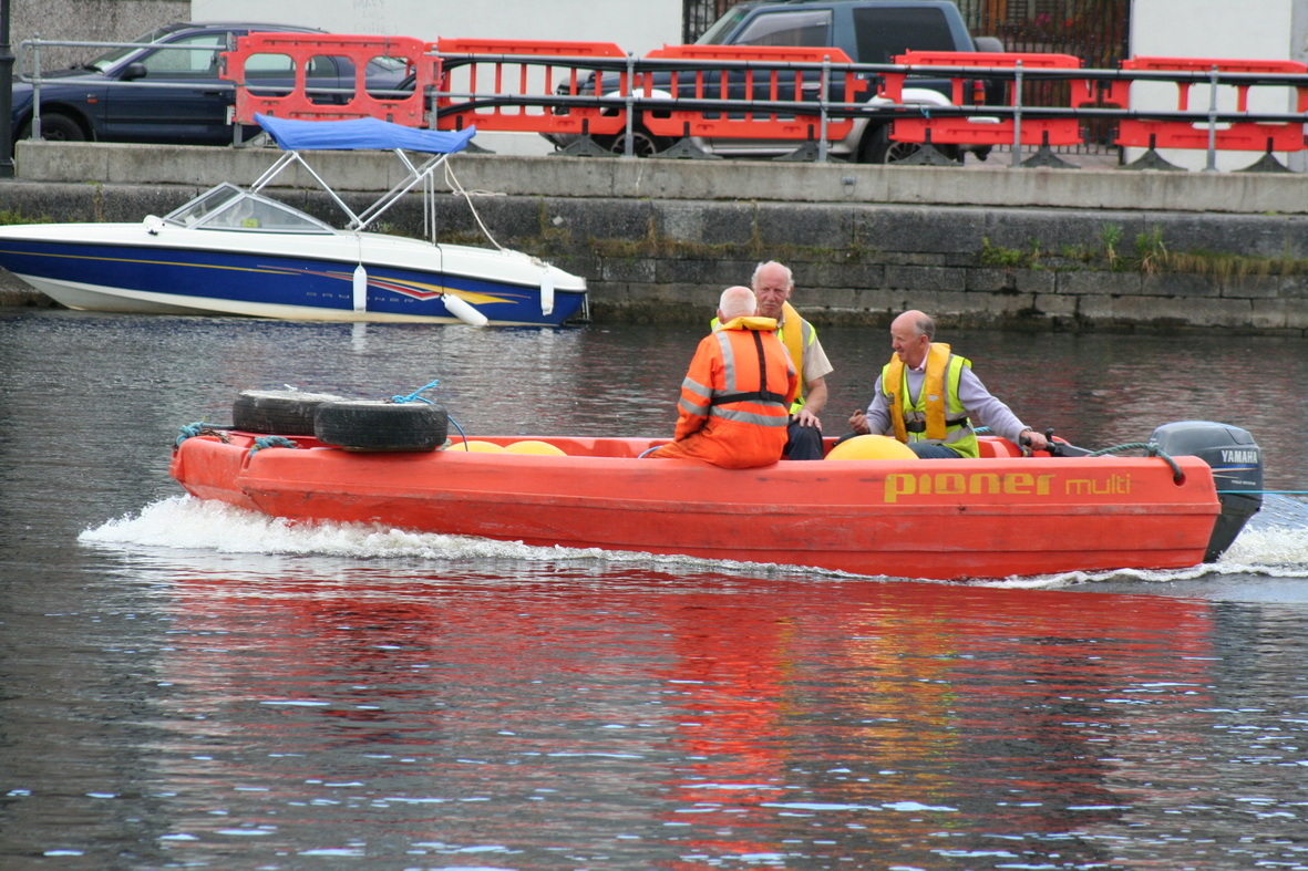 Anyway, the interesting part is that WI had a crew in Athlone for some time beforehand, laying buoys for the markers for the swimming courses. The Coill-an-Eo was at the centre of events, moored on the east side of the river above the weir, with WB2 and a second workboat, as well as a Pioner Multi. (There are more photos of WI workboats on this page.)
