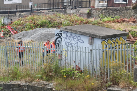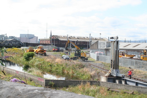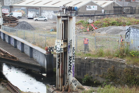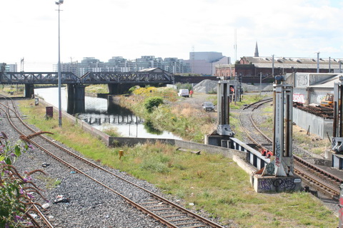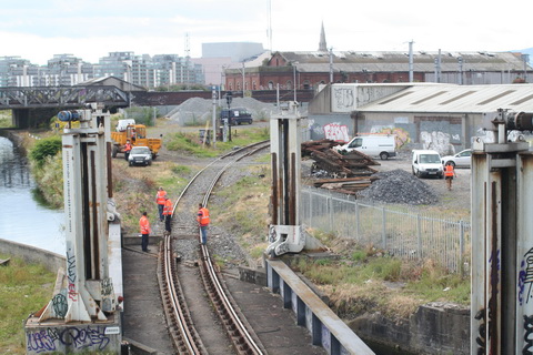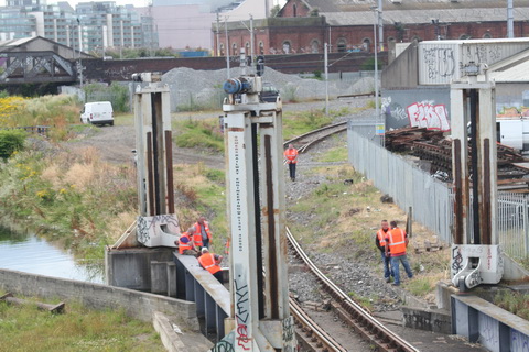 One minute later: 0946. A separate group of workers, perhaps contractors, is going down the west side of Spencer Dock with equipment