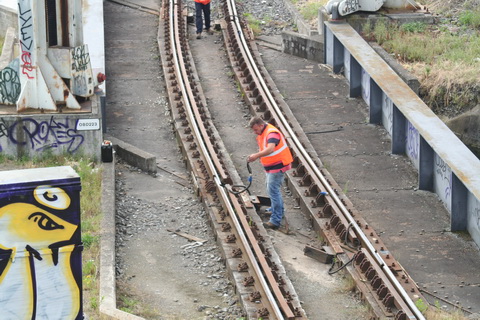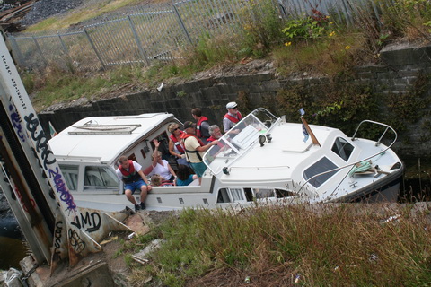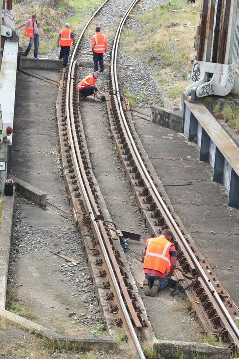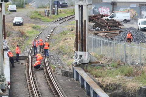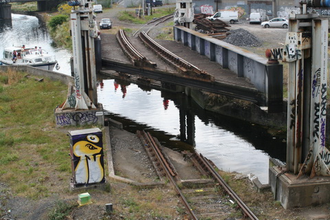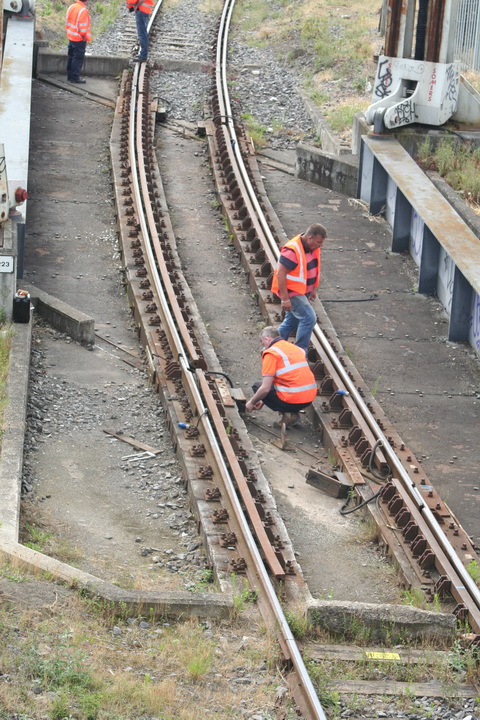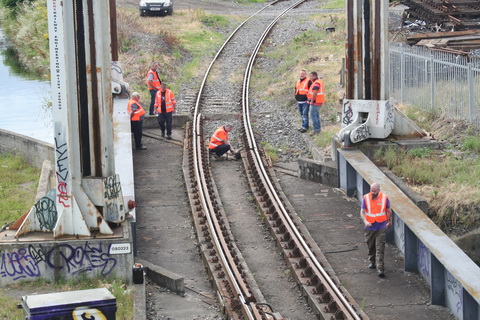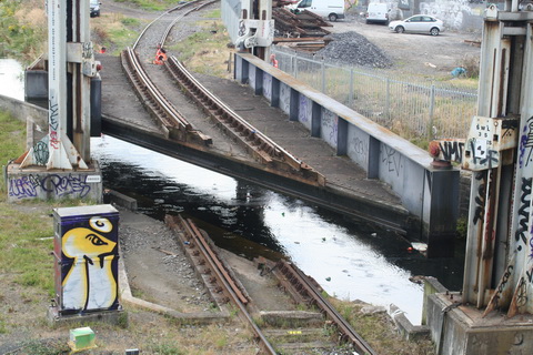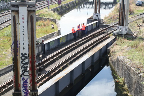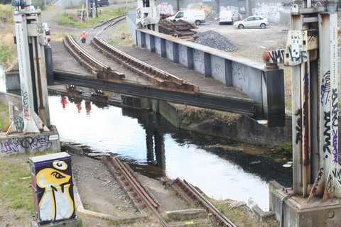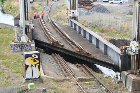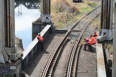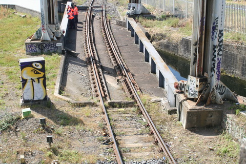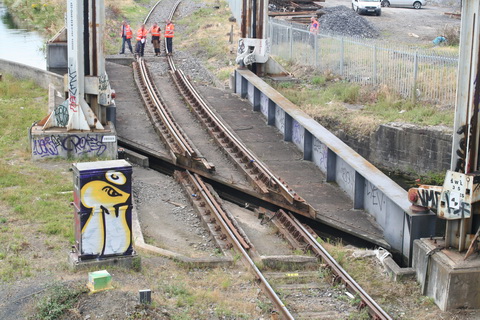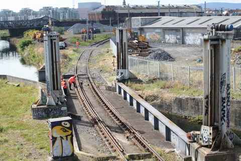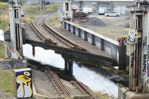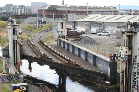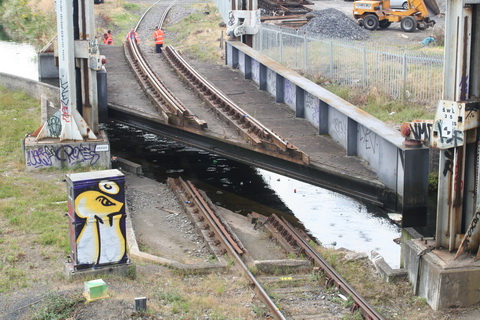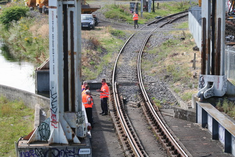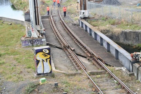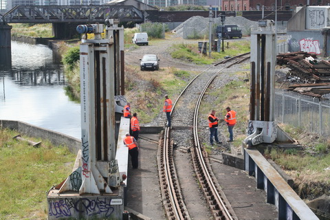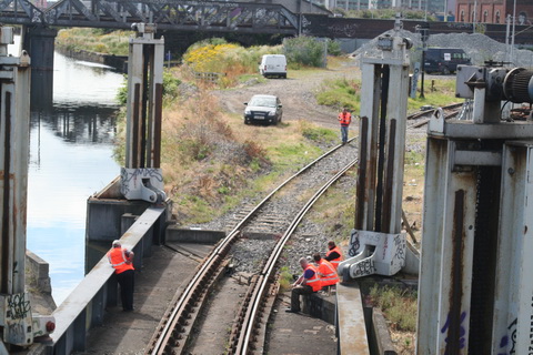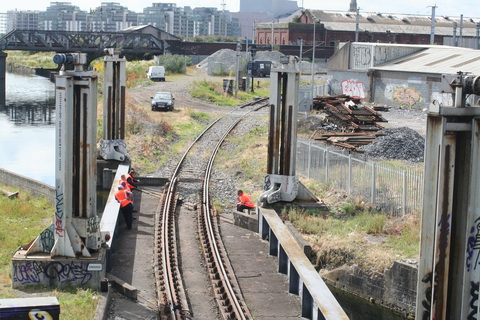 A lift scheduled for early July 2014 was cancelled; yesterday’s lift catered for just two boats, whose passage was assisted or monitored by eight Irish Rail staff and four from Waterways Ireland. Four of the Irish Rail people may have been in training as others seemed to be demonstrating things to them, but that’s only a guess. Three of the WI staff travelled together in WI’s stealth van and operated the first lock; the other, who travelled separately in a 4WD vehicle, visited from time to time. As far as I could see there was no contact between the Irish Rail and WI teams.