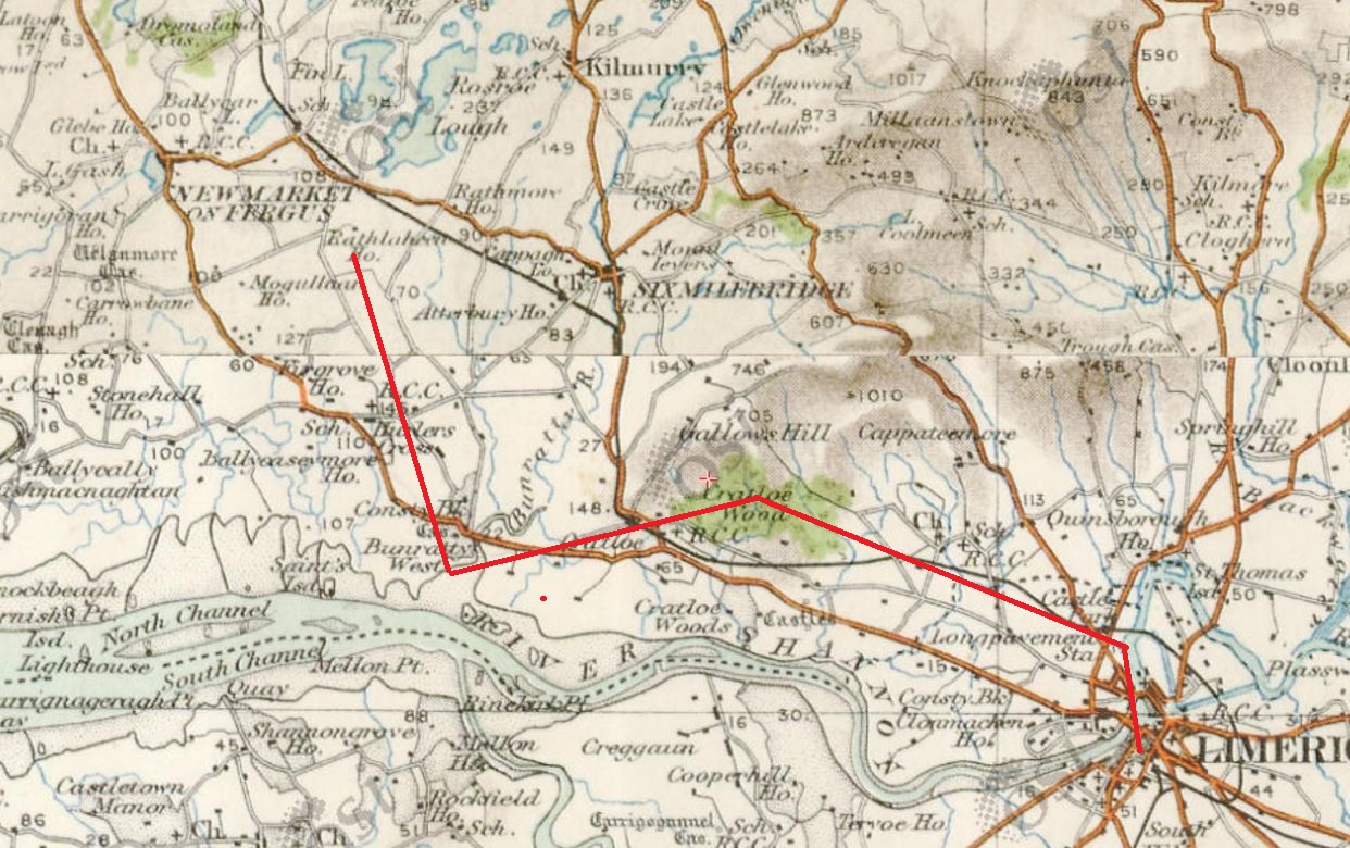 The prospect of Limerick was very extraordinary, every street, lane, and building, being at the same moment distinctly visible, but so apparently diminished in size that it assumed more the appearance of a beautiful miniature model than the actual city; the expanse of view was vastly greater than I anticipated, the various windings of the Shannon, with little interruption, being visible to Killaloe, above which the grand and noble expanse of water on Lough Derg was a prominent feature, flanked on either side with a lofty range of mountains. The view of the lower Shannon was also very attractive, extending far below the Beeves’ tower, and on which was visible one of the river steamers towing, I will not say a large ship, for it appeared no bigger than a turf boat.