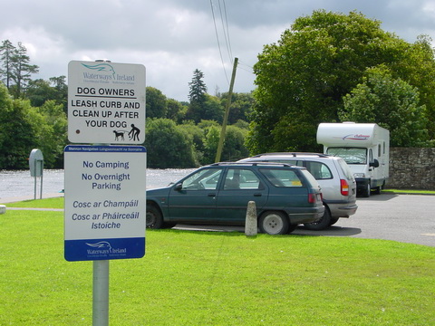 So owners of RVs (recreational vehicles, camper-vans, what you will) are forced to sneak in to Waterways Ireland harbours and to park inconspicuously along the edges. The best place to park is usually indicated by a sign.