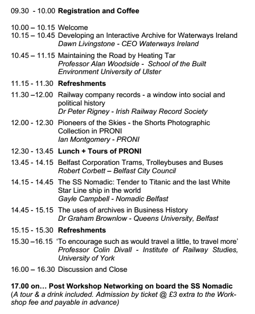 The [two-page PDF] brochure is downloadable here PRONI transport archives workshop. The workshop fee is £20/€25 with an extra £3/€3.50 for the SS Nomadic visit. Sterling cheques are accepted; there is provision for paying in euro by online banking.
