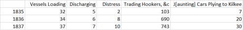 [Note: the quantity exported in 1836 was given as 87 firkins. Peter M Solar (“The Irish Butter Trade in the Nineteenth Century: New Estimates and Their Implications” in Studia Hibernica No 25 1990) suggests an average weight of 67.6 lb per firkin at Limerick in the early 1820s. Applying that figure gives a weight of 5881.2 lb or 52.5 long UK hundredweight, rounded to 53 cwt. There is nothing to say whether any of the amounts for Kilrush exports are gross or net weight; Solar says that “Earlier in the nineteenth century the weight of the cask was generally taken to be a fifth of the weight of butter it contained.”]